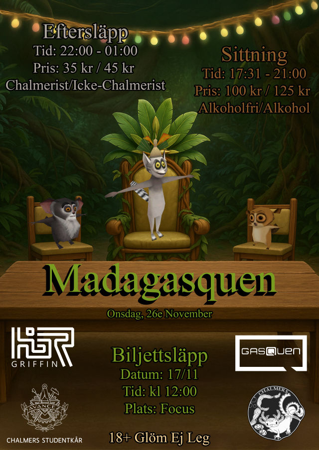När natten faller och djungelns rytmer väcks till liv öppnar vi dörrarna till eftersläppet. Från 22:00 till 01:00 ska ni dansa, skratta och move it, move it tills ni inte längre vet var ni bor. Inträdet kostar 35 kr för Chalmerister och 45 kr för alla andra vilsna själar som ännu inte förstått storheten i att vara del av Chalmers.